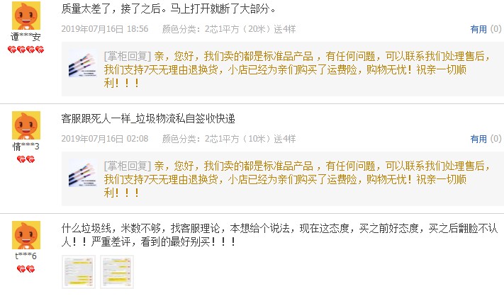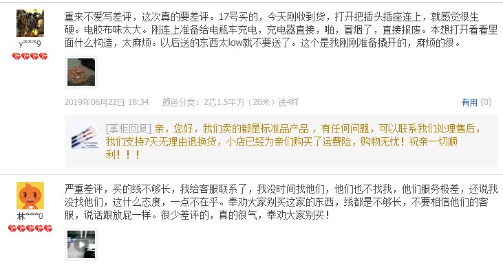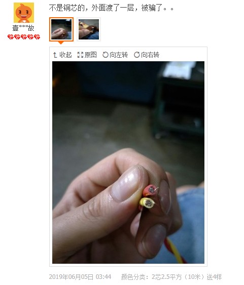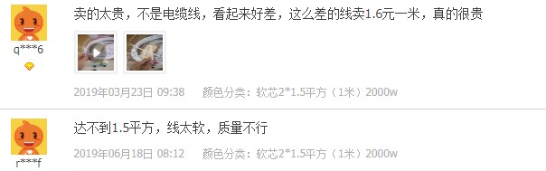 評價(jià)截圖有很多,我這邊就不一 一發(fā)出來了,總結(jié)幾個(gè)特征,冒充國標(biāo),截面積虛標(biāo),米數(shù)不足,導(dǎo)體斷線,鋁鍍銅,這個(gè)就是低價(jià)的本質(zhì),如果你是買回家當(dāng)擺設(shè)并且不怕刺鼻味的,盡可能多買點(diǎn),其余用途作為晾衣繩都怕斷。